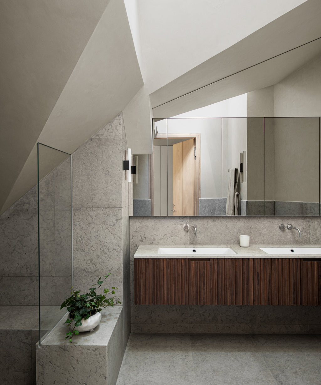Brede, massive egetræsplanker fra Dinesen understreger lejlighedens rummelighed og udsynslinjer. Vores kalksten, Lindanäs børstet, dækker både gulv og væg i begge badeværelser. Taktiliteten og udseendet af den børstede sten forstærker den naturlige følelse. Alle snedkerier er specialdesignet og bygget på stedet af Retsloff Snickerier. Fremstillet af massivt valnøddetræ.