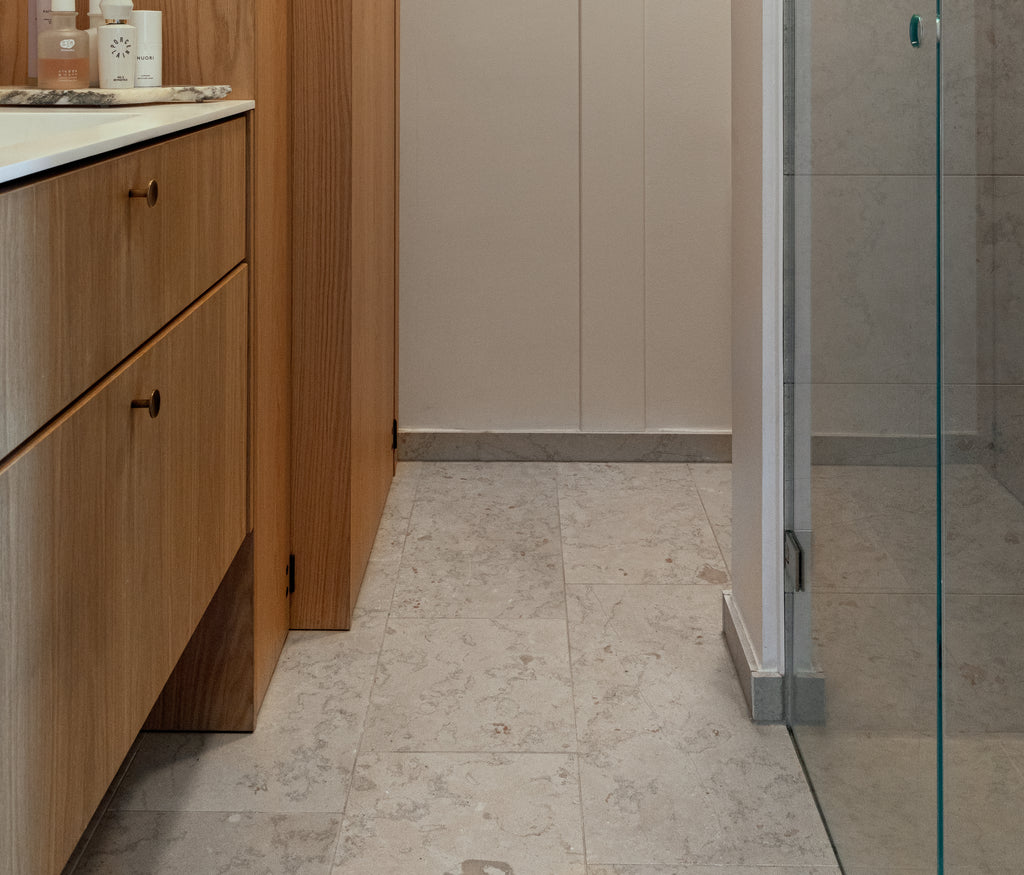 Min kæreste opdagende Östersjösten via Instagram og eftersom vi allerede var i processen med at designe det nye badeværelse delte han det med mig og jeg kunne med det samme lide det jeg så. Jeg forsøgte at bestille en materialeboks men dengang sendte i ikke til Danmark. Jeg kontaktede Deniz som informerede mig om de forskellige sten. Lige inden vi skulle lægge ordren opdagede jeg Norrvange kalksten fra Gotland, som på det tidspunkt var ny i jeres sortiment. I sidste øjeblik ombestemte vi os og bestilte Norrvange matslebet.