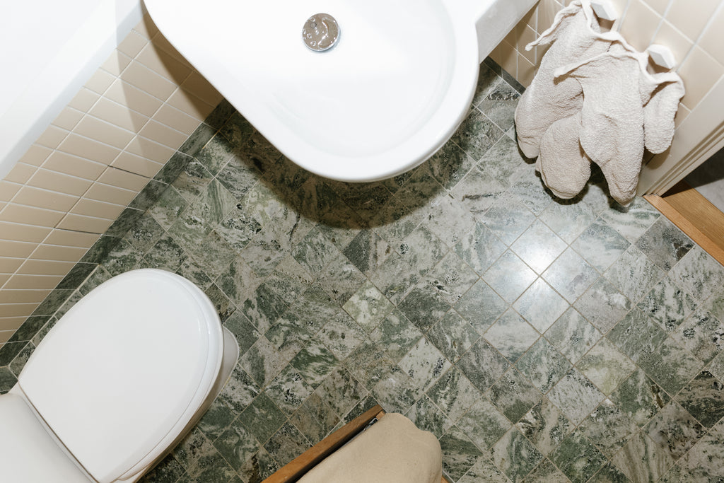 Vi udvidede, så vi fik to toiletter, et brusebad og et badekar og benyttede samtidig lejligheden til at udskifte de kedelige plastmåtter og fliser, der var fra 90'erne. Kolmårdsmarmor på gulvene var et vigtigt udgangspunkt, den smukke grønne farve og stenens liv synes jeg tilføjer et klassisk præg, der passer godt til pastelfarverne. Vi valgte at få slebet 10x10 cm fliser af Kolmårdsmarmor på gulvet, og en cremehvid stående flise på væggene.