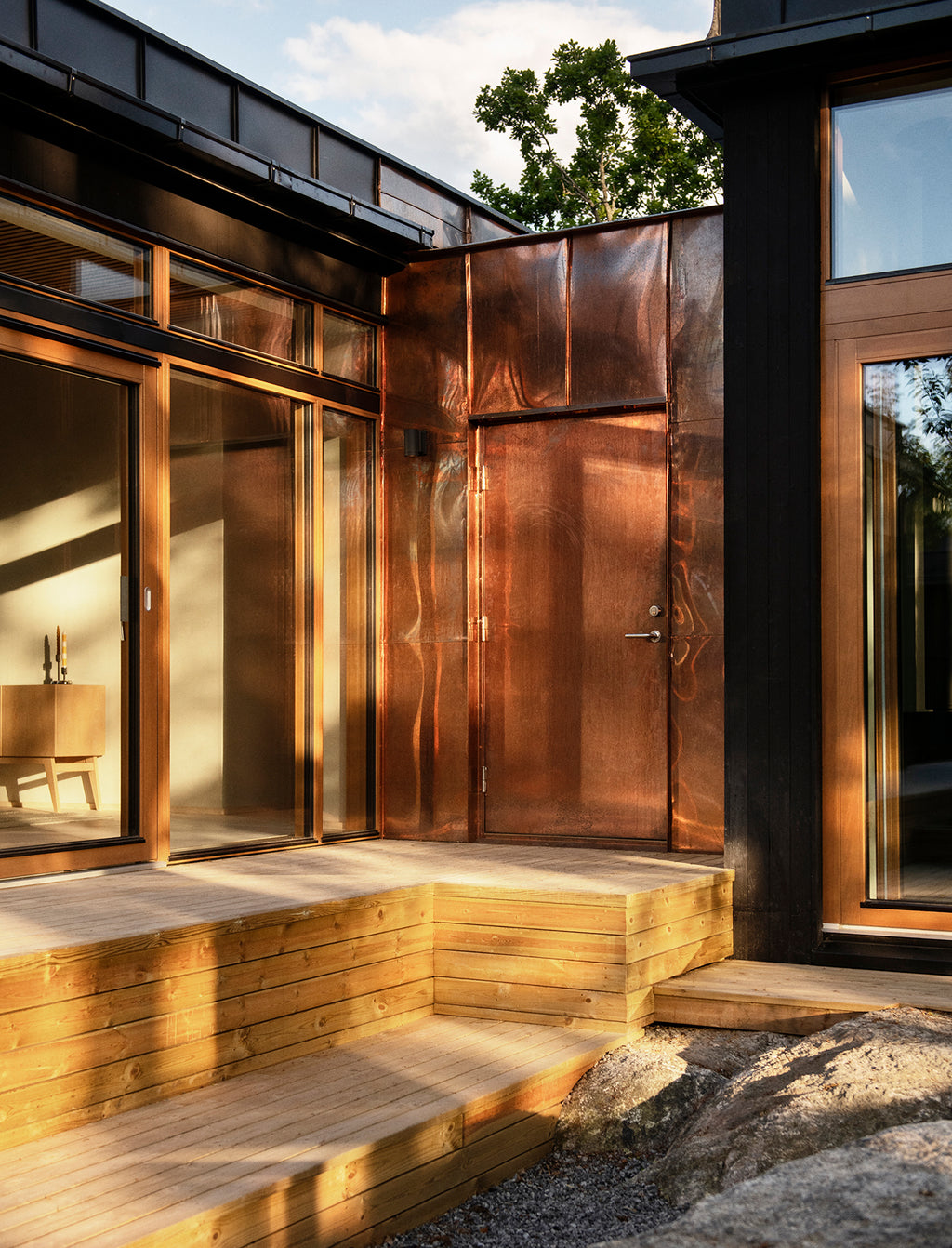 Indretningsarkitekt Rebecka Haymoz arbejdede på ideen om at udviske grænserne mellem inde og ude. Hun ville skabe en forlængelse af Jennys vision om at de pæne huskroppe naturligt ville overtage den klippeafsats de står på, med et interiør, der føles let og luftigt, men som samtidig er selvindlysende i sit design.